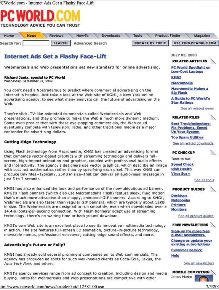 You don't need a Nostradamus to predict where commercial advertising on the internet is headed. Just take a look at the web site of KMGi, a New York online advertising agency, to see what many analysts call the future of advertising on the web. They're slick, TV-like animated commercials called Webmercials and Web Presentations, and they promise to make the web a much more dynamic medium. Some even predict that with these eye-popping commercials, the web could eventually compete with television, radio, and other traditional media as a major contender for advertising dollars.”